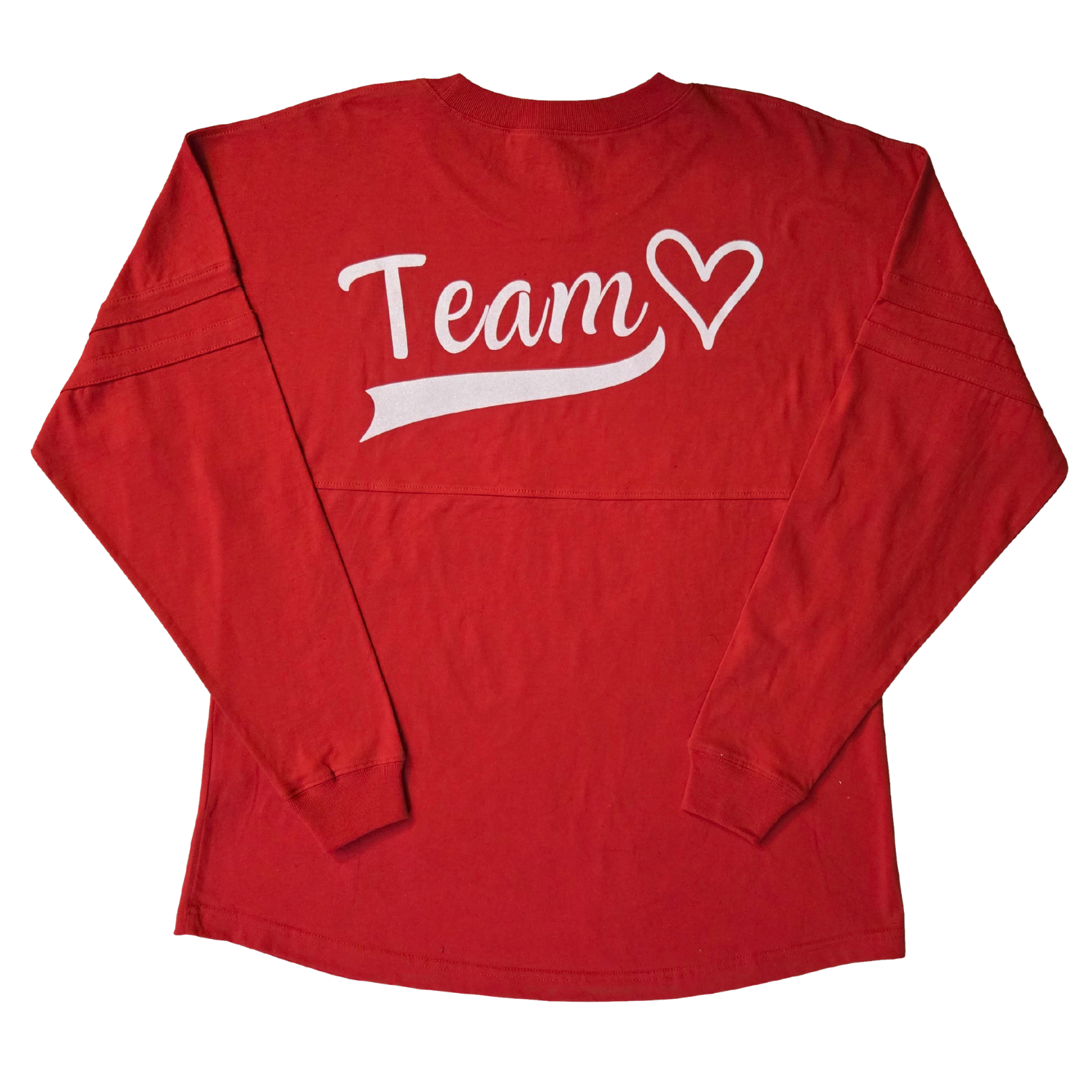 Back of shirt: White "Team" text with a stylized underline and accompanying heart design.