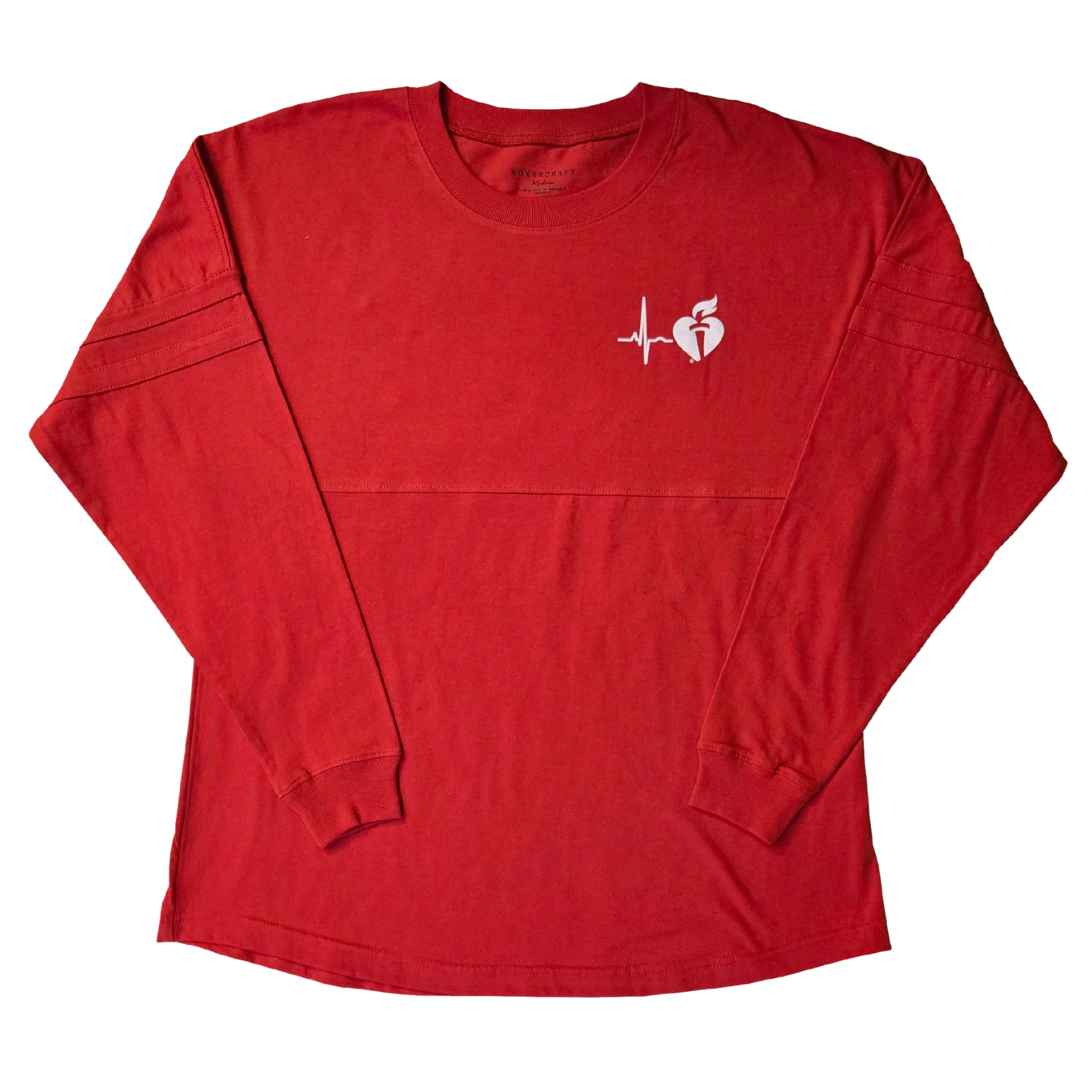 Join the AHA Team in style with our oversized Team Heart pom Jersey! Glitter ink adds some fun and femininity to this comfy tee, perfect for game days or casual wear.