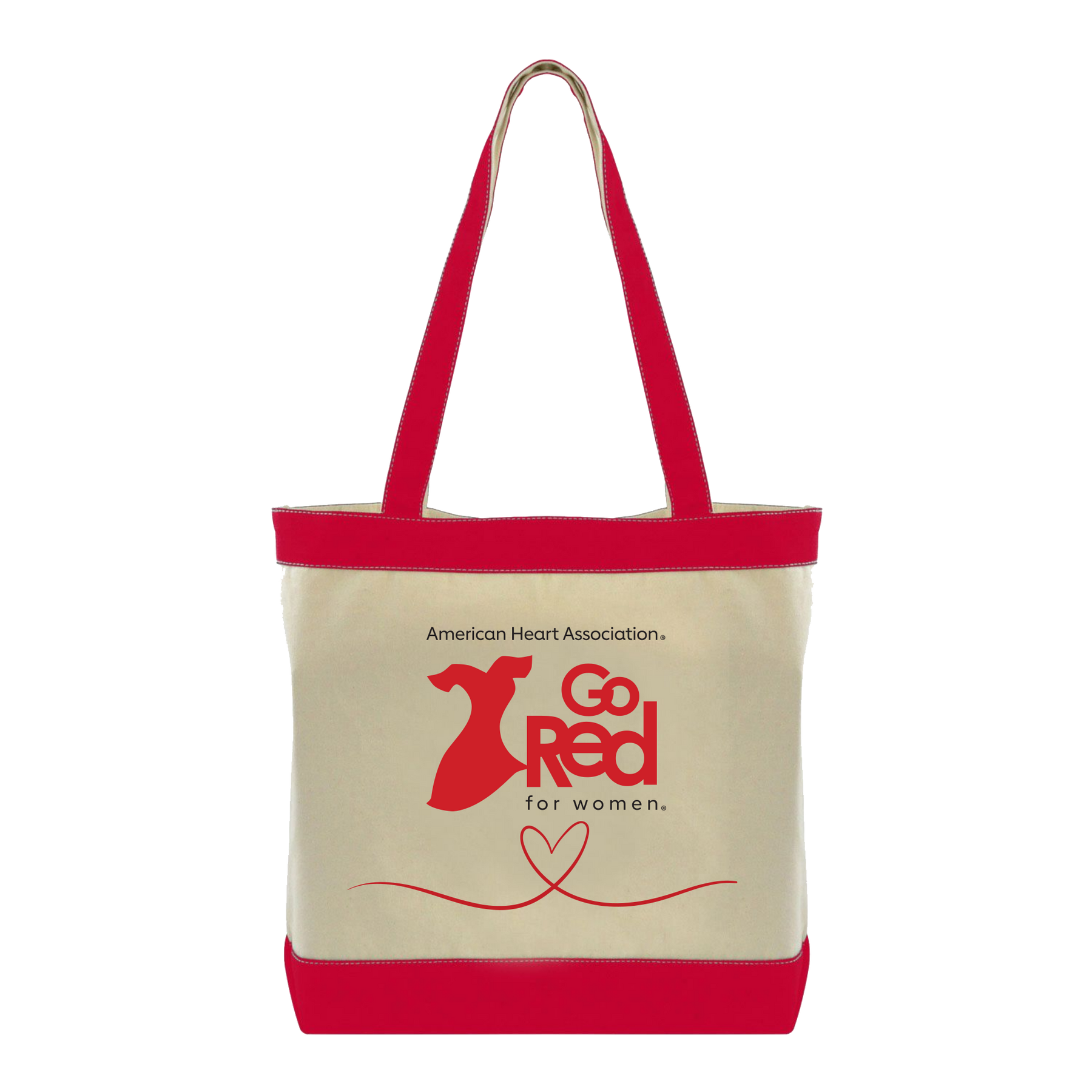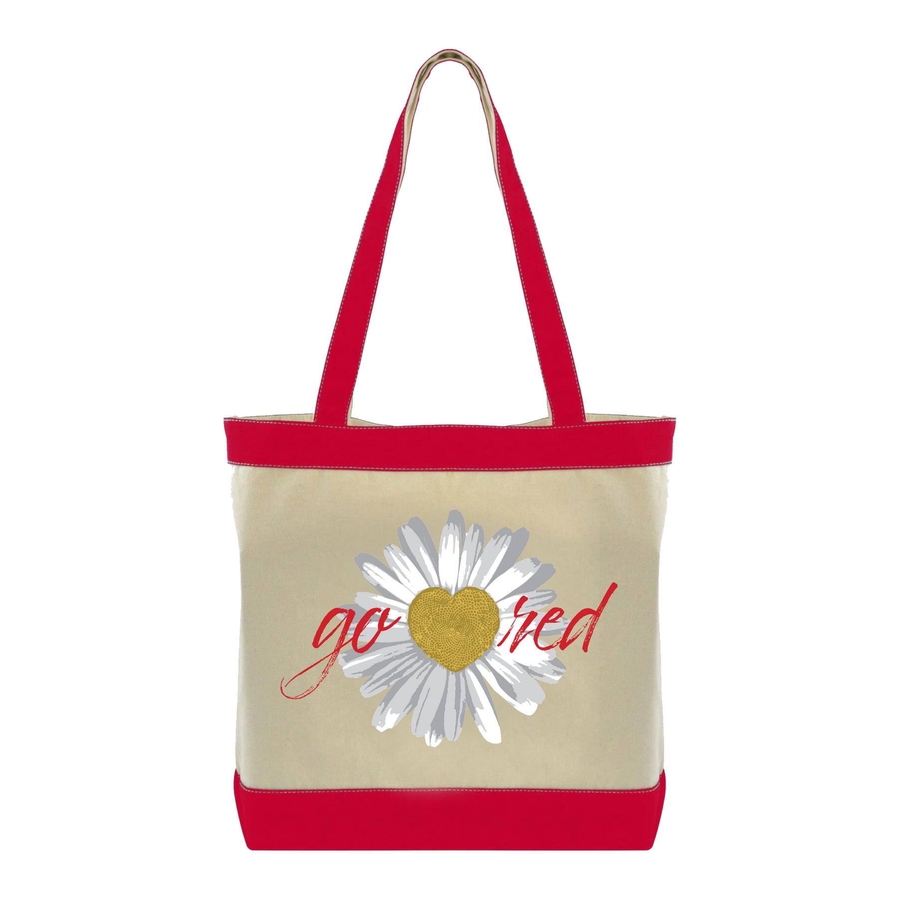 Our Go Red tote is made from natural beige cotton with red accents, including dual-tone handles—red on one side and beige on the other. One side of the tote displays the Go Red for Women logo, while the other is adorned with a daisy design featuring a heart-shaped center and our call-to-action, Go Red! Features an expanded flat bottom (gusset) for added capacity.