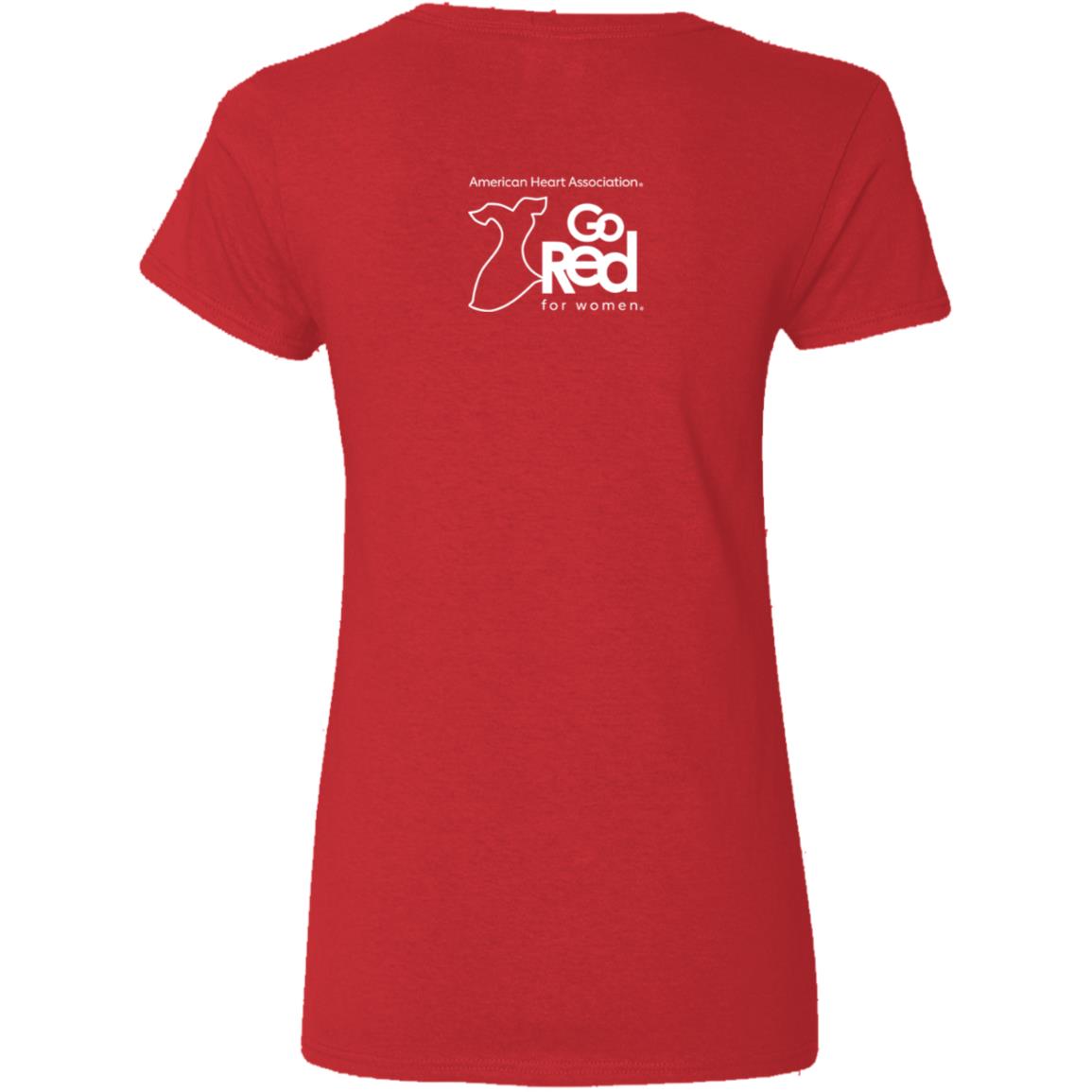 Red V-neck Womens shirt with "go red for women" and the Red Dress logo across the chest