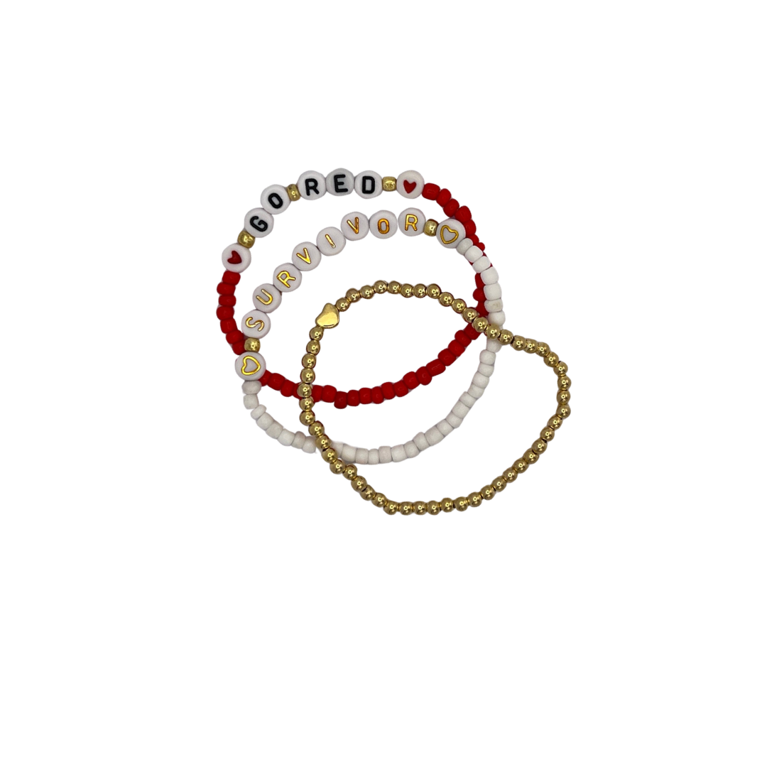 • "Survivor" in gold on white beads, surrounded by white beads & heart beads