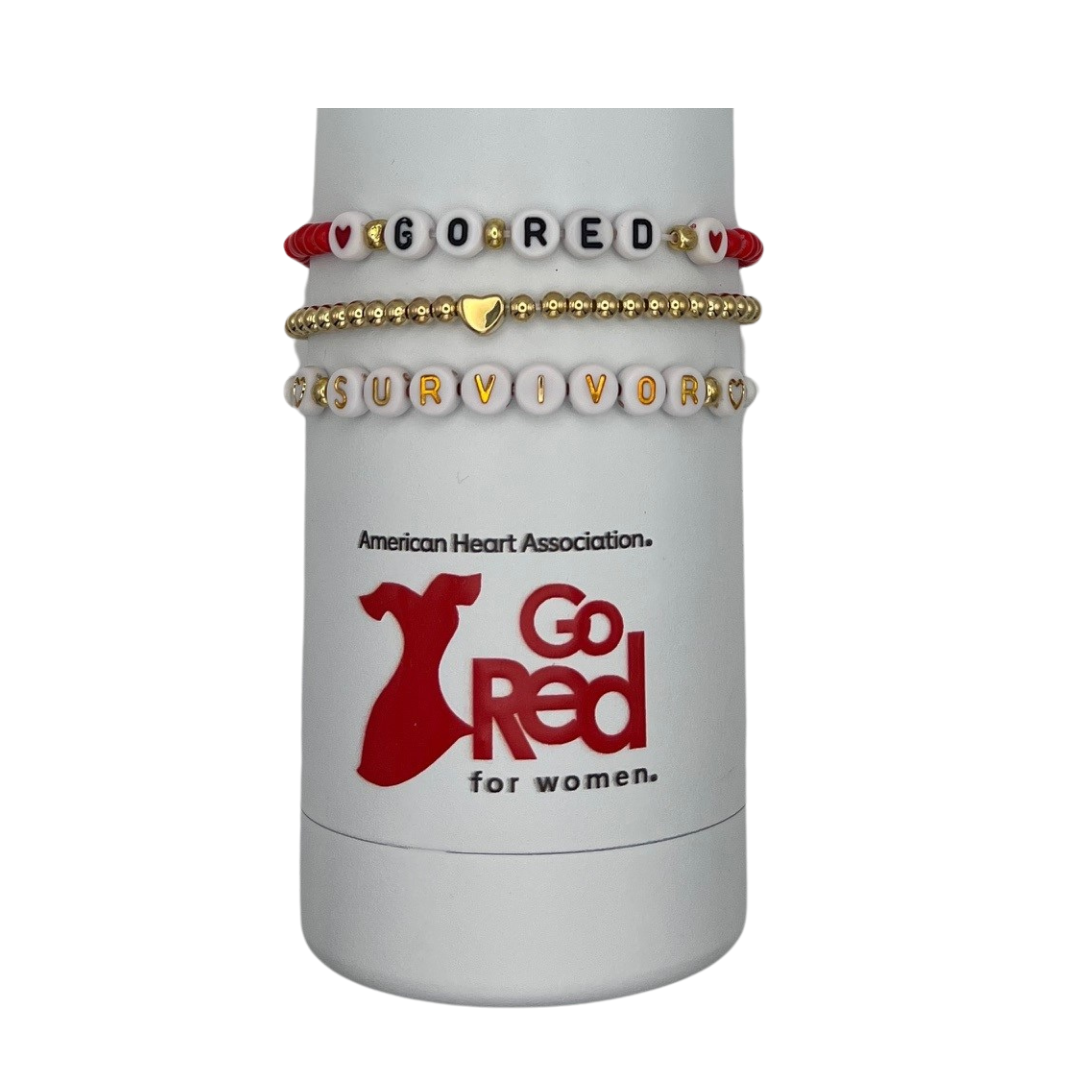Picture of set of 3 bracelets: one says go red with red beads, one says survivor in gold on white beads, and other has gold beads and heart. Two cards stating Go Reds mission for women. "Heart disease unfairly targets women. Fortunately, women have an amazing resource each other.