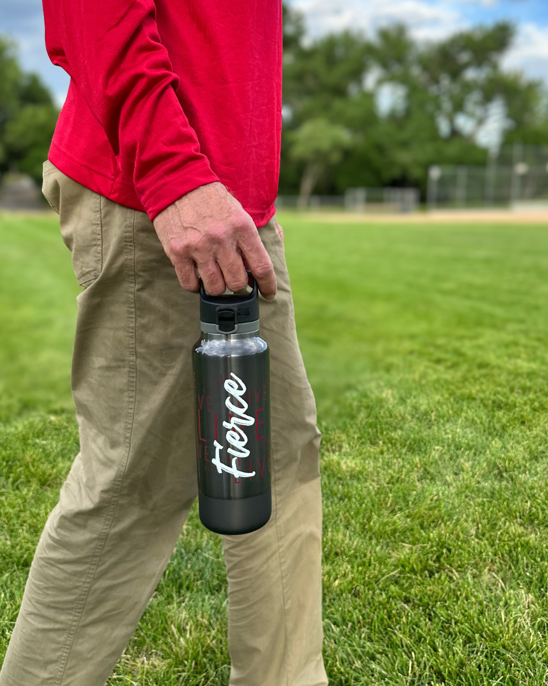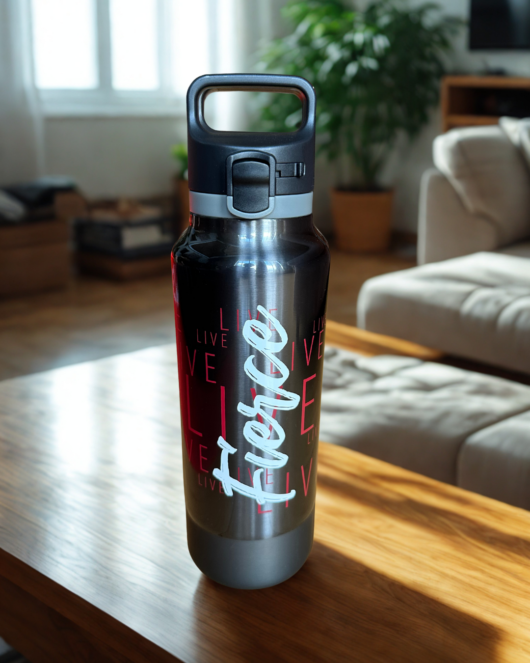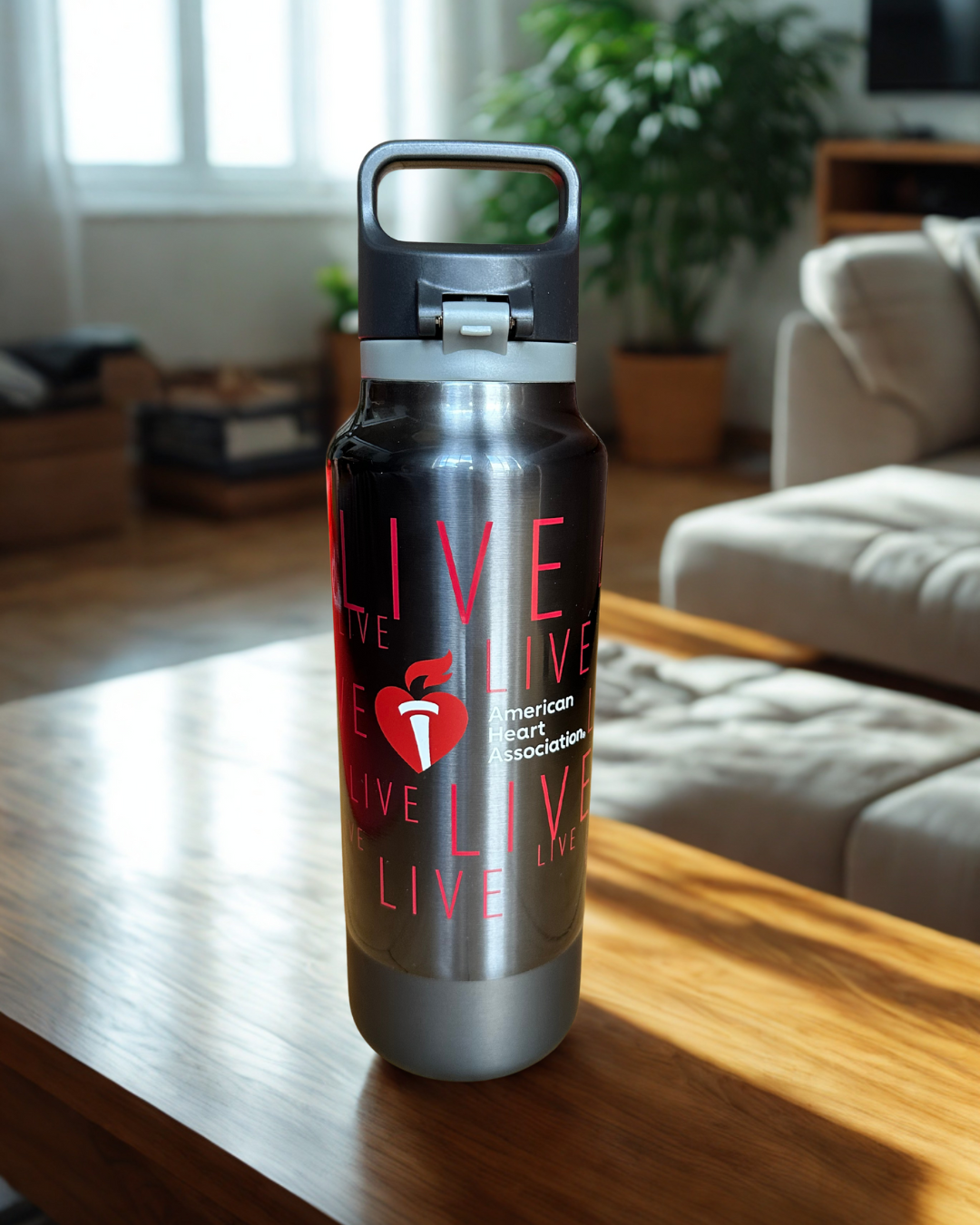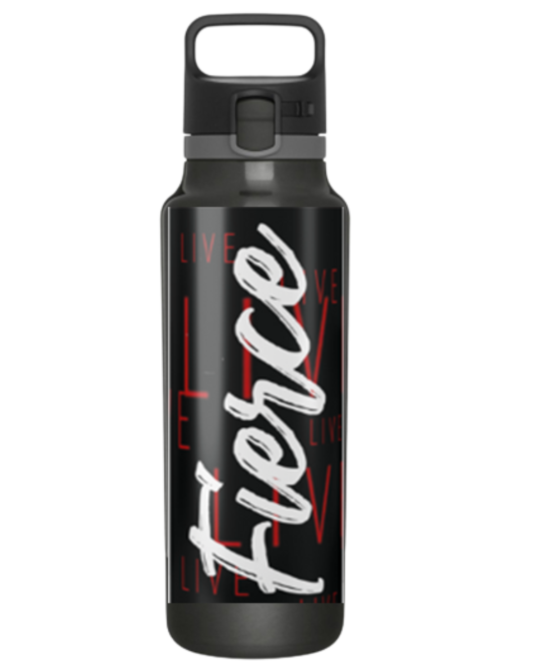 Stay hydrated and Live Fierce with the Live Fierce Water Bottle! LIVE is in red in the background around the bottle with "Fierce" in bold on the front and the AHA logo on the back. Its compact and durable design makes it perfect for on-the-go use.