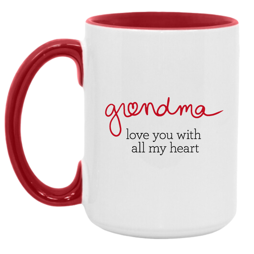 White mug with inside red finish and red handle. Side 1 "grandma" in handwriting like font with "love you with all my heart" text below. Side 2 Red dress symbol inside a heart shape.