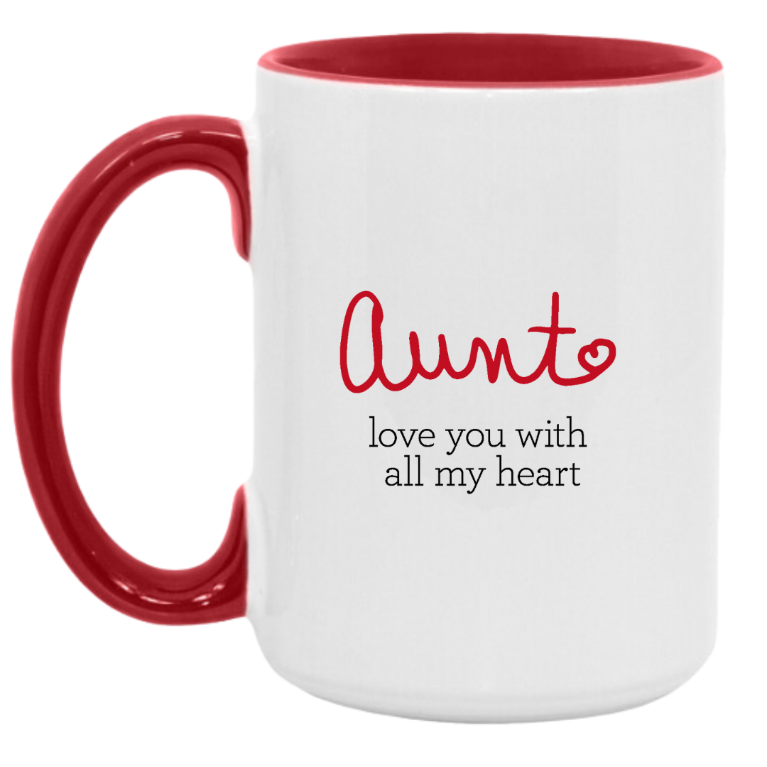 White mug with inside red finish and red handle. Side 1 "aunt" in handwriting like font with "love you with all my heart" text below. Side 2 Red dress symbol inside a heart shape.