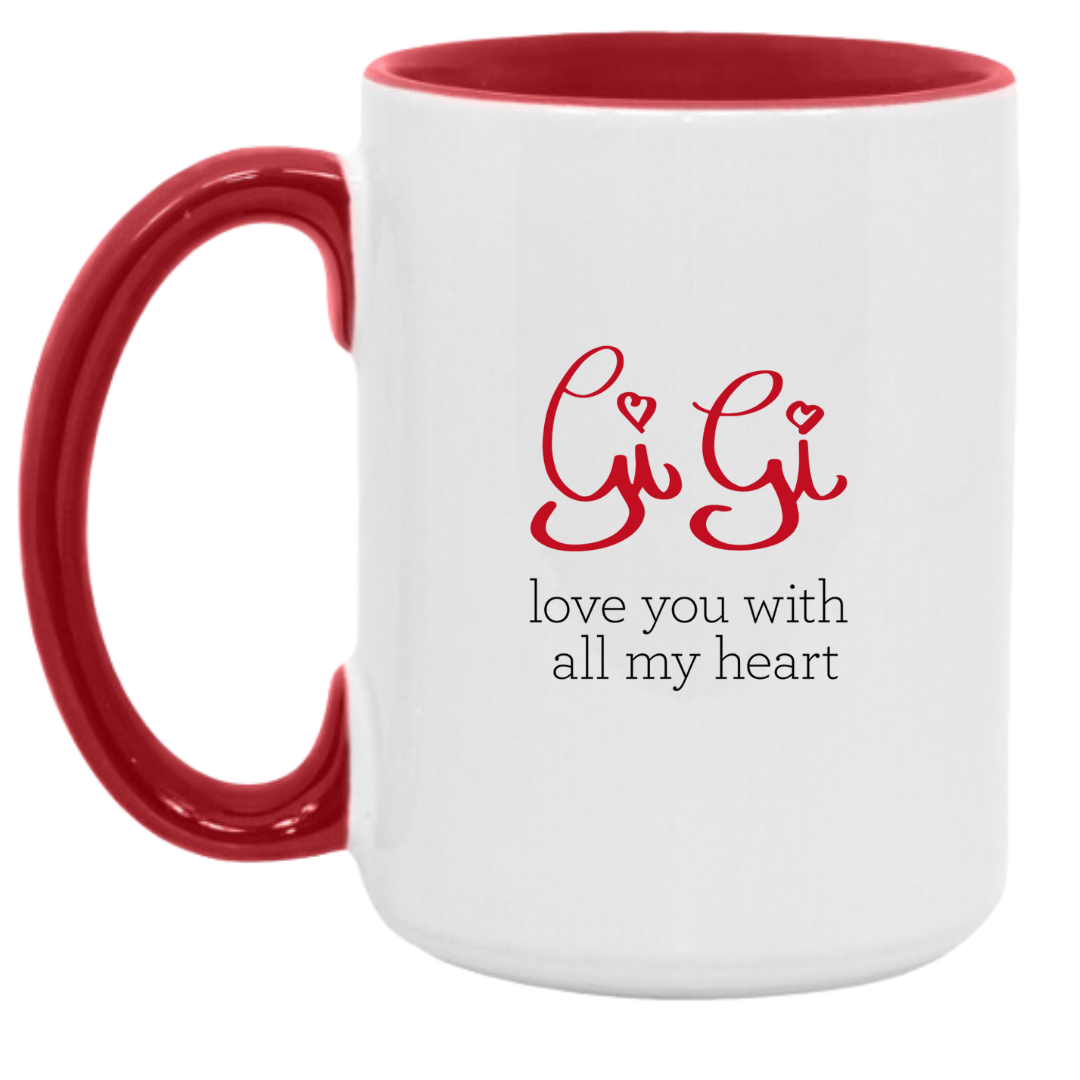 White mug with inside red finish and red handle. Side 1 "Gi Gi" in handwriting like font with "love you with all my heart" text below. Side 2 Red dress symbol inside a heart shape.