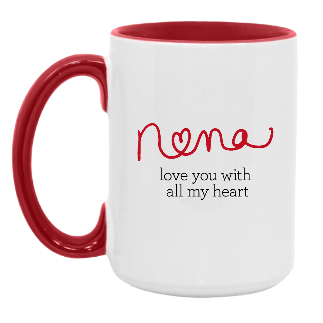 White mug with inside red finish and red handle. Side 1 "nana" in handwriting like font with "love you with all my heart" text below. Side 2 Red dress symbol inside a heart shape.