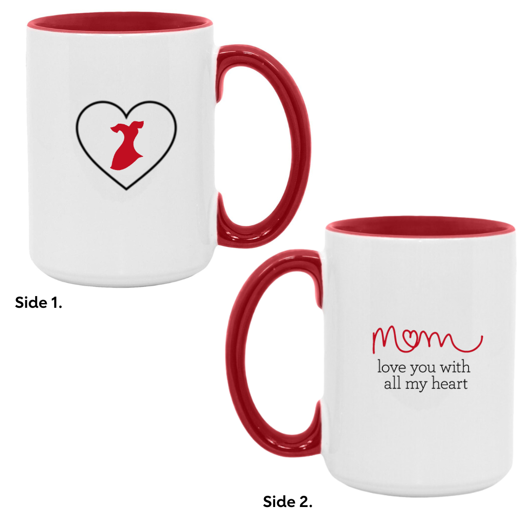 White mug with inside red finish and red handle. Side 1 "Mom" in handwriting like font with "love you with all my heart" text below. Side 2 Red dress symbol inside a heart shape.