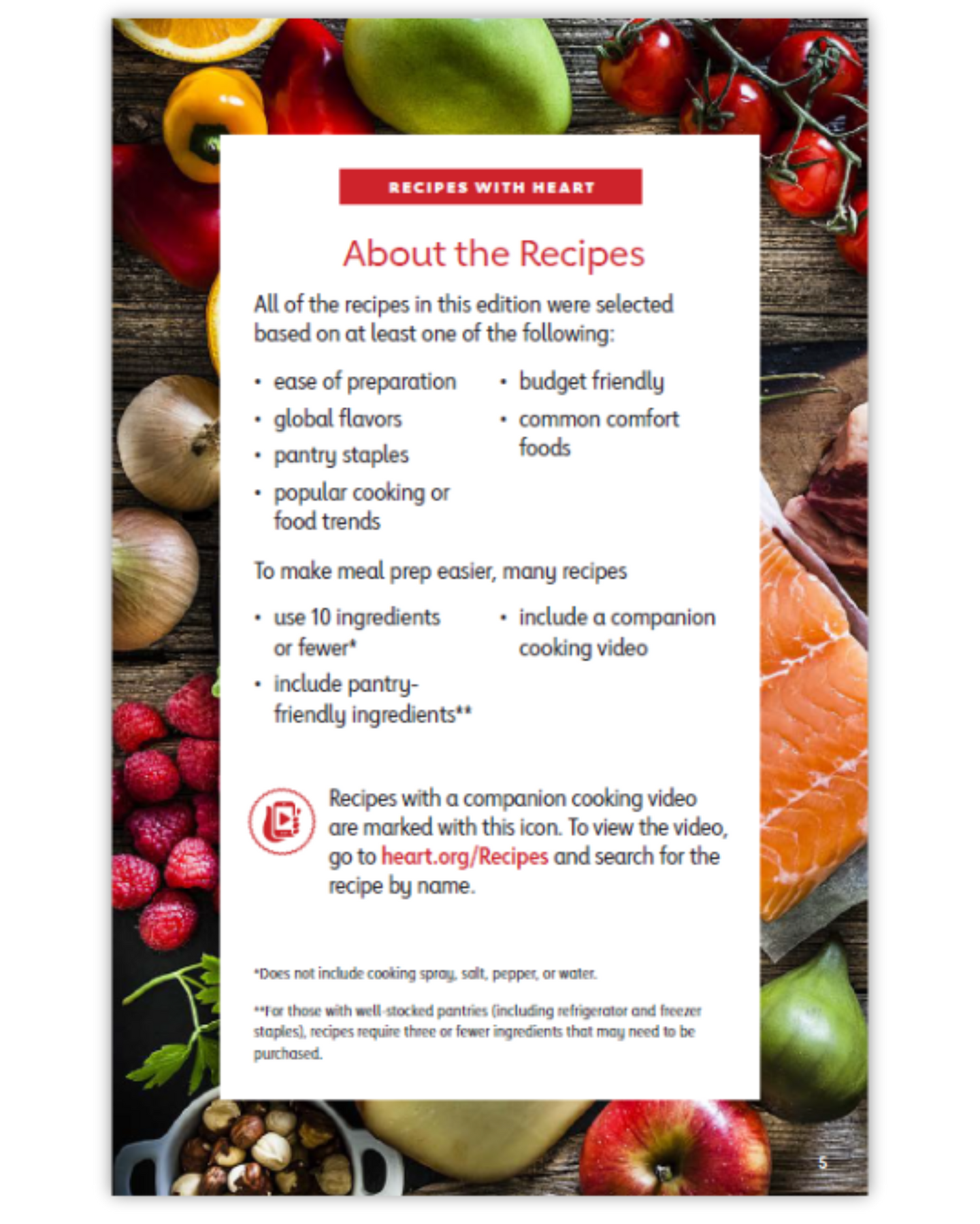 Serve up this collection of simply delicious, heart-healthy recipes designed to encourage good eating habits for all ages. The 20 recipes in this collection were selected for ease of preparation, use of pantry staples and wide appeal, along with being smart nutritional choices. Beautiful full-color photos help entice readers into the kitchen. Companion cooking videos are also available online for many of the recipes.