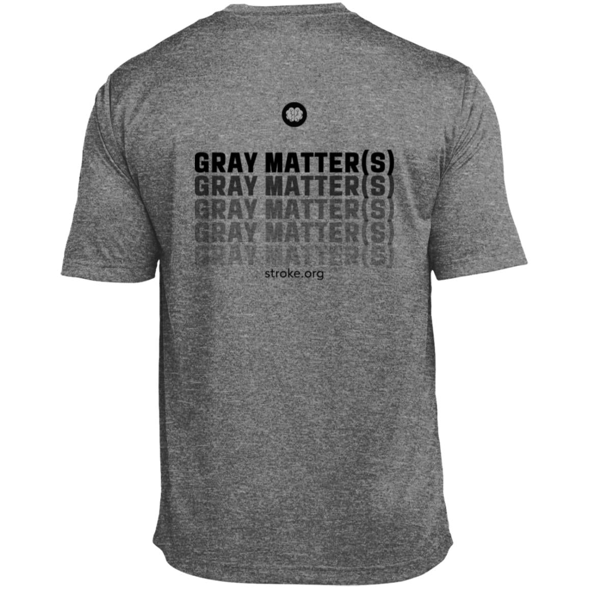 Back of shirt. Brain Icon above Gray Matter(s) text repeated 5 times in black fading away. Stroke.org printed beneath.