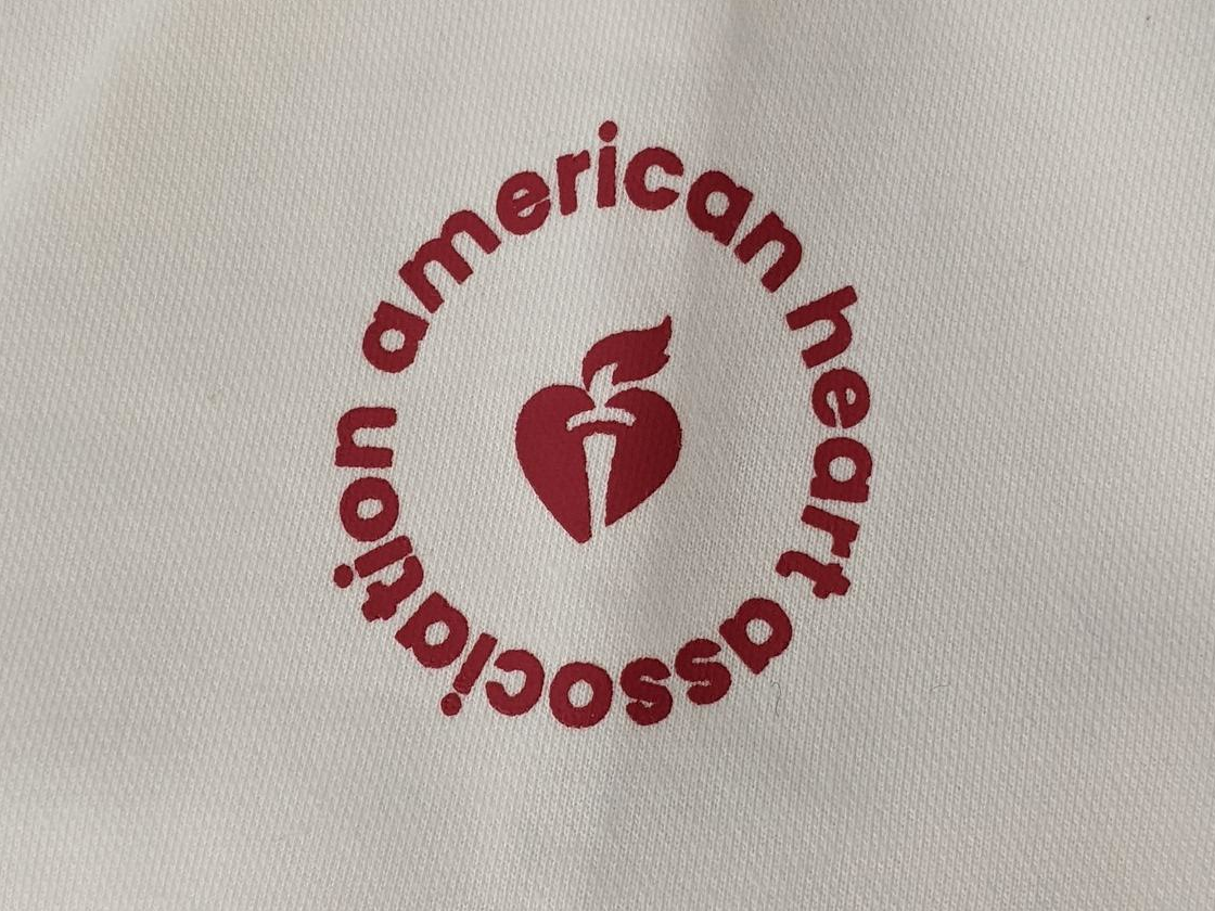 Closeup of left sleeve AHA circular logo.