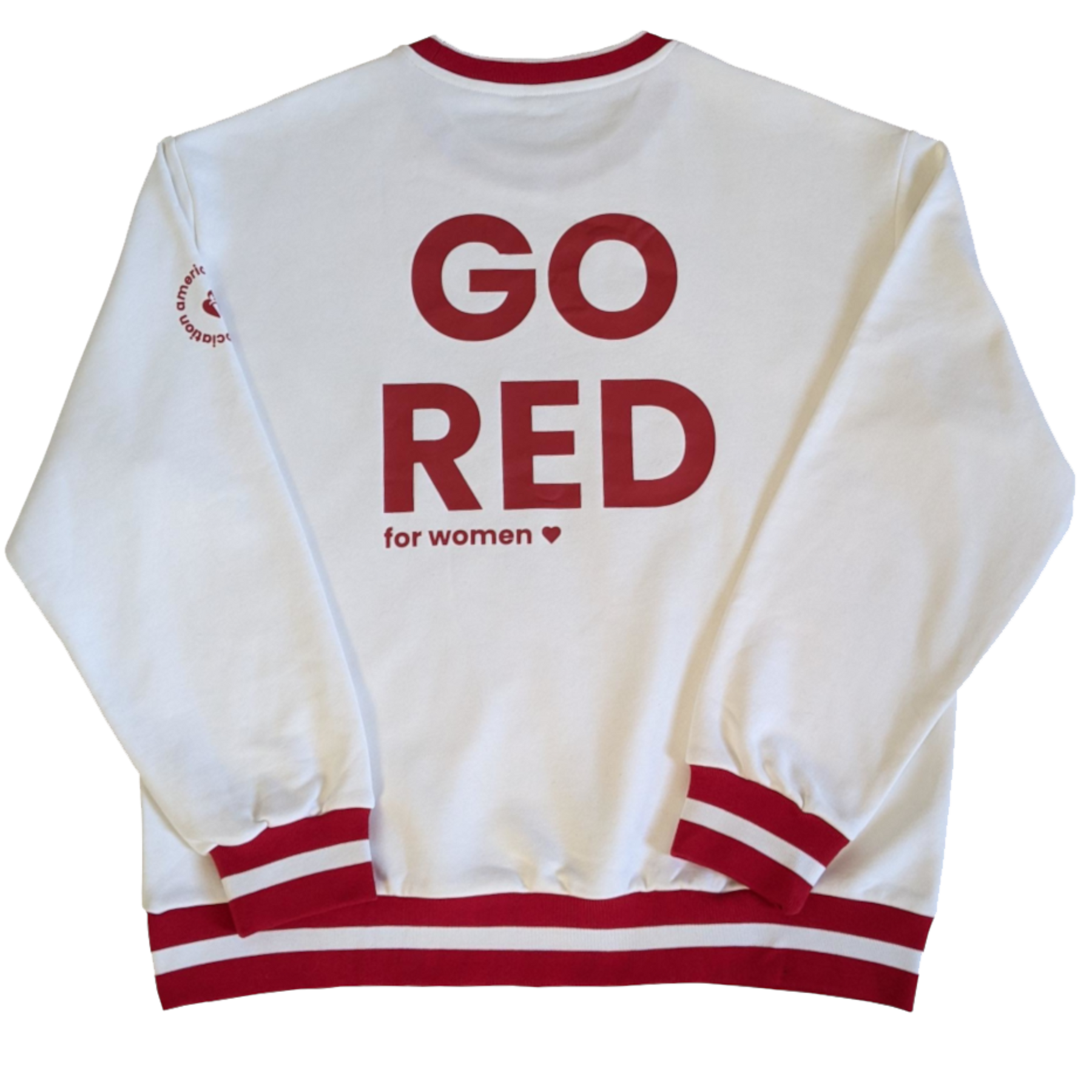 Back of white sweatshirt features large letters saying GO RED for WOMEN. neck and cuffs have red stripes for a varsity look.