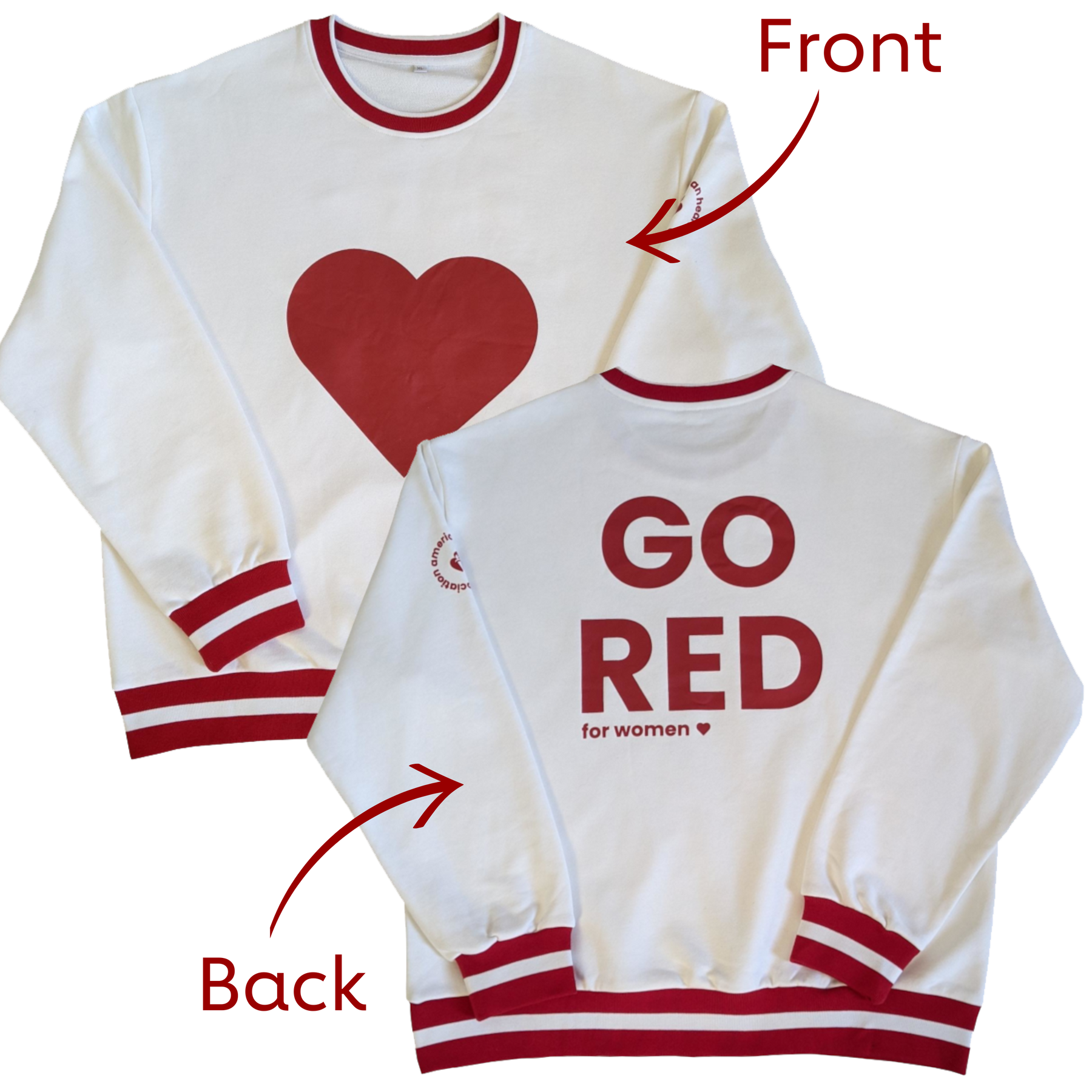 front and back of white sweatshirt. neck and cuffs have red stripes for a varsity look. Front has a large red heart and back says in large letters GO RED for WOMEN. AHA name and logo on sleeve.