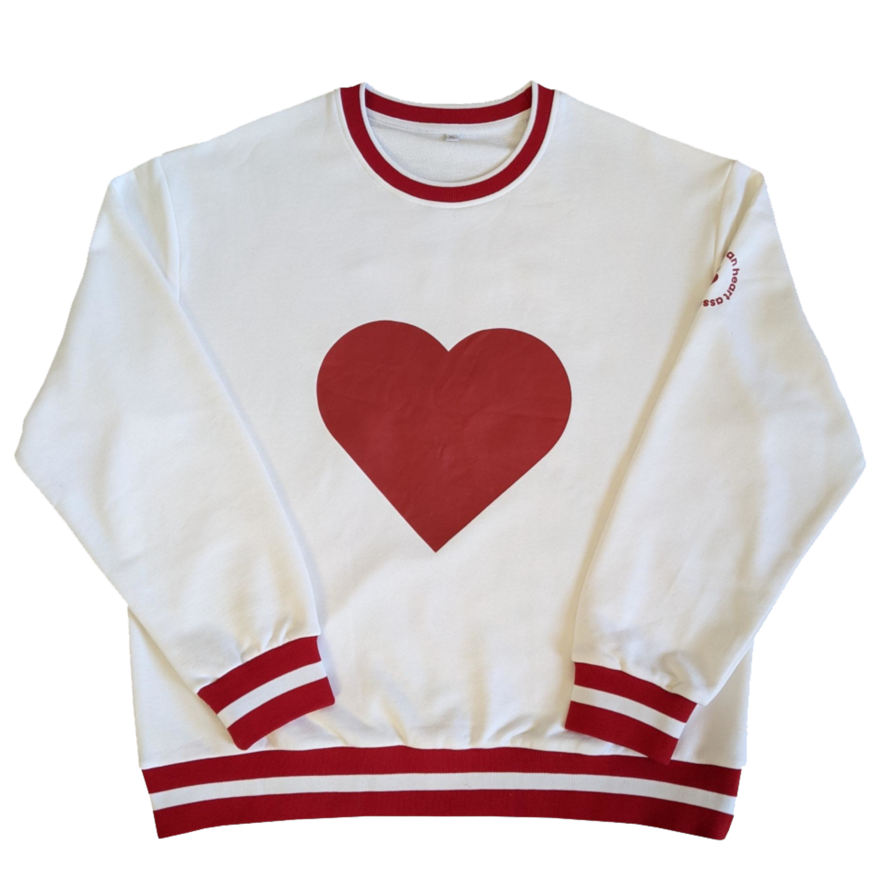 Front of white sweatshirt has a large red heart.  AHA name and logo on sleeve. neck and cuffs have red stripes for a varsity look.
